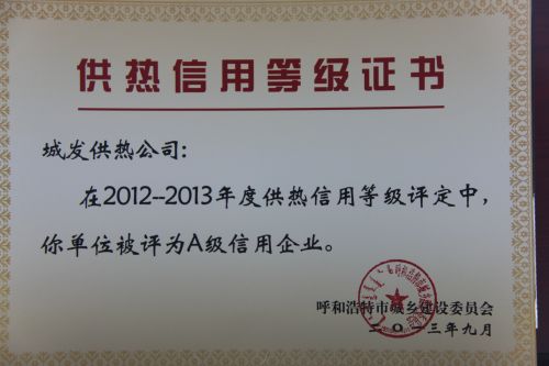 呼市城發供熱被評為A級信用企業