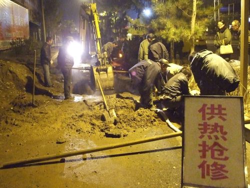 工作人員兵分幾路,對一次網和熱力站進行泄水,同時在跑水地點進行開挖,并將水抽干,待破損管網露出后,按預定技術方案進行更換和焊接。時值入冬,夜間溫度已在零下,相關領導及搶修人員一直在現場工作,無人休息,毫無怨言。在寒風中工作人員咬緊牙關,爭分奪秒,連續奮戰了10多個小時,終于在第二日凌晨7時,成功將跑水事故處理完畢,并于12時恢復了熱力站正常運行。
